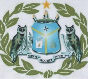 Гербовий щит увінчано короною з палаючих факелів, пензля та пера. Під щитом на синій стрічці слова: «Мудрість, знання, розум», які проголошують головні цінності вчителів та вихованців.